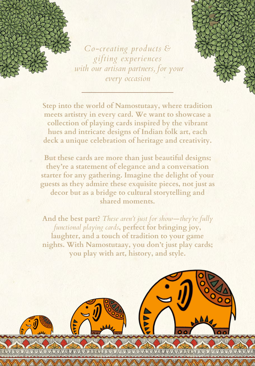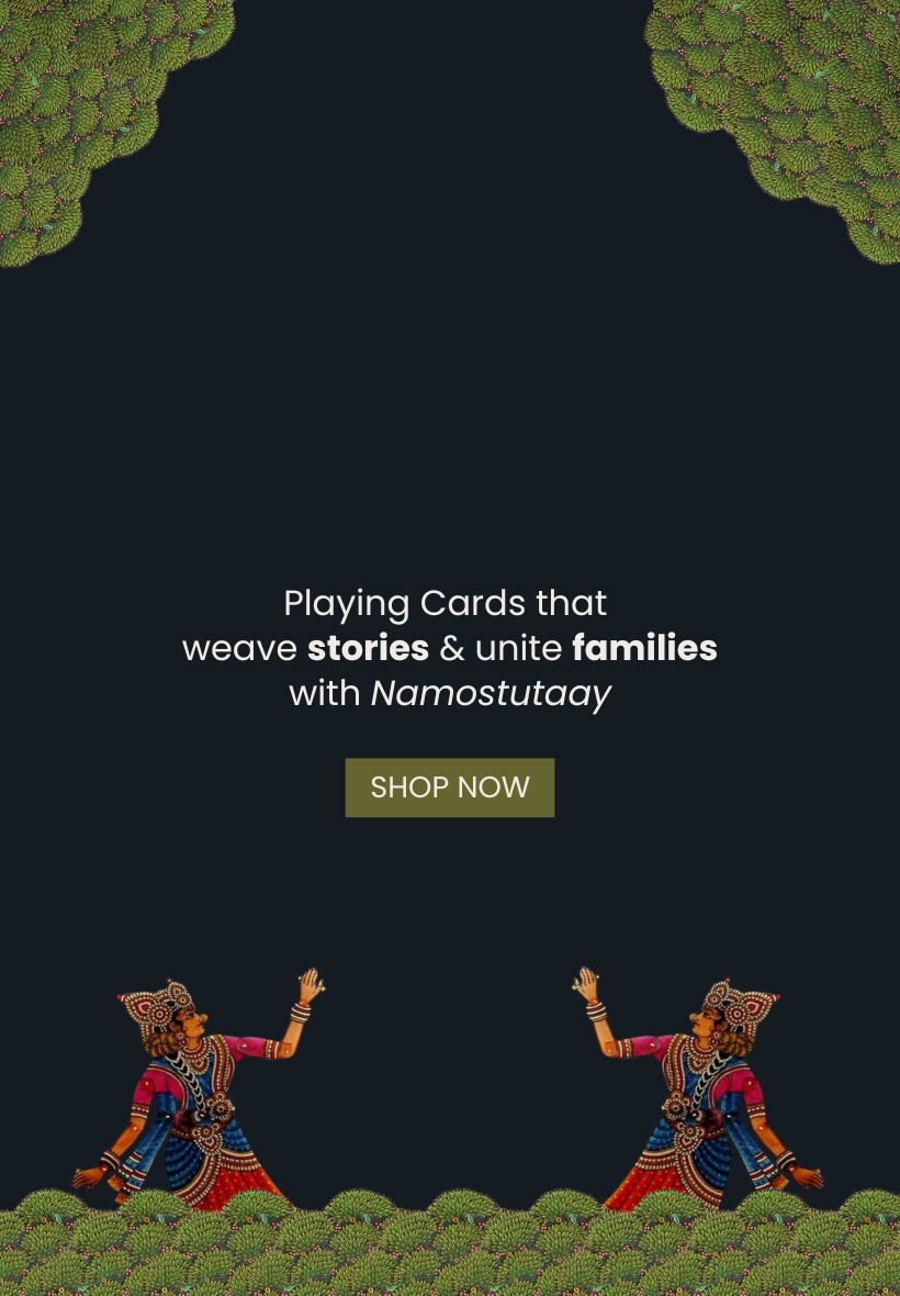 Welcome to Namostutaay, where every playing card is a canvas of tradition and craftsmanship. Explore our unique collection, thoughtfully designed by artisans who breathe life into India’s rich folk art. Discover the beauty of culture in every deck and bring home a piece of heritage today. Make your games more meaningful—Shop Now!